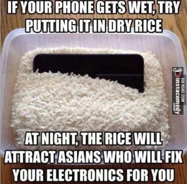 Wat heeft geen zin: -Het toestel in de rijst leggen, de buitenkant wordt misschien droog maar de rijst “zuigt” het toestel echt niet van binnen droog! |